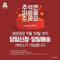 KGC인삼공사는 택배배송이 종료되어도 정관장 제품을 당일 주문해 당일 배송 받을 수 있는 '당일신청·당일배송' 서비스를 시행한다.당일신청·당일배송 서비스는 추석을 앞두고 태풍 등의 영향으로 미리 선물을 구매하지 못한 고객을 감안해 일반 택배가 마감되는 6일부터 10일