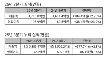 대상은 3분기 매출이 1조1454억원으로 전년 동기 1조1118억원 대비 3% 증가했다고 14일 밝혔다. 3분기 누적 매출액은 3조3519억원으로 전년 3조2105억원보다 4.4% 늘었다.3분기 영업이익은 509억원으로 전년 동기 516억원보다 1.3% 감소했다. 누적