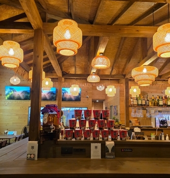 28일 오후 7시경 찾은 일본 미야코지마섬 시모자토 히라라 소재 '플로브(FLOV)'. 이곳은 야비지, 패들 투어를 즐긴 이들이 주로 찾는 휴양지 감성의 카페이자 펍이다. 입구에 들어서자마자 가장 먼저 눈에 들어오는 것은 바 한켠을 가득 메운 빨간 컵라면. 바로 농심의