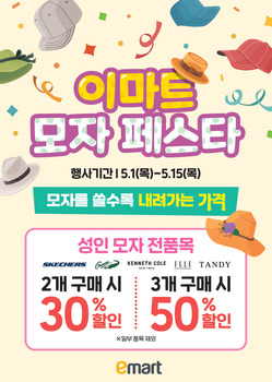 이마트는 오는 15일까지 약 1000여종의 모자를 최대 50% 할인하는 ‘모자 페스타’를 진행한다고 9일 밝혔다.확보한 물량 금액만 약 150억원에 육박하는, 이마트의 첫 패션 잡화 대규모 행사다.이마트는 모자 전 브랜드 통합 할인 행사를 선보인다. 9980원부터 3만