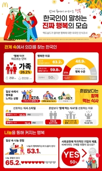 한국인들은 가족 등 가까운 관계 속에서 행복을 느끼며, 타인과 함께하는 식사 등 사소한 경험을 통해 삶 전반의 행복을 완성해 나가는 것으로 조사됐다. 기부와 봉사 등 주변과의 나눔을 통해 느끼는 보람도 의미가 큰 것으로 나타났다.한국맥도날드는 이와 같은 내용이 담긴 ‘