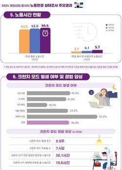 게임업계 종사자들이 마감 시간을 앞두고 근무를 연장해 집중적으로 일하는 크런치 모드를 경험한 비율은 줄었지만 주당 최대 근로시간은 늘어난 것으로 나타났다.3일 한국콘텐츠진흥원이 발간한 ‘2024 게임산업 종사자 노동환경 실태조사와 글로벌 게임 정책 법제 연구 보고서’에