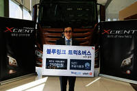 <KT>와 <현대자동차>는 [트라고 엑시언트 1호차 전달식]을 갖고 [블루링크 트럭&버스 with 올레] 상용서비스를 시작한다고 11일 밝혔다. [블루링크 트럭&버스 with 올레]는 지금