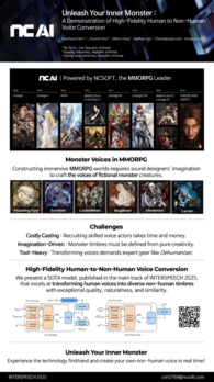 NC AI가 세계최대 음성·언어기술 학회서 몬스터 사운드 생성·변환 AI 기술을 공개한다고 17일 밝혔다.NC AI는 이번 학회에서 몬스터 사운드에 특화된 고품질 음색 변환 모델의 구조와 학습 기법을 상세히 다룬 논문을 발표한다. 현장에서는 방문자가 마이크를 통해 말을