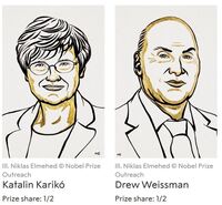 올해 노벨 생리의학상은 코로나19 메신저리보핵산(mRNA) 백신 개발 주역인 헝가리 출신의 커털린 커리코(68) 바이오엔테크 수석 부사장과 미국 펜실베이니아 대학 의대 드루 와이스먼(64) 교수 몫으로 돌아갔다. 스웨덴 카롤린스카 연구소 노벨위원회는 코로나19