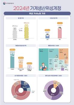비경제활동으로 분류되는 집안일도 경제적 가치가 582조원에 달해 국내총생산(GDP)의 약 23% 수준이라는 분석이 나왔다. 국가데이터처가 29일 발표한 '2024년 가계생산 위성계정(무급 가사노동 가치 평가)'에 따르면 재작년 무급 가사노동의 가치는 582조4
