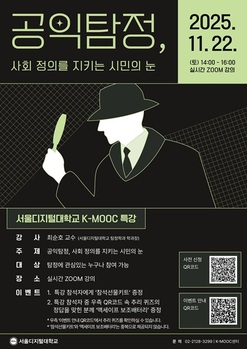 서울디지털대학교는 탐정학과 최순호 교수가 오는 22일 오후 2시부터 K-MOOC(한국형 온라인 공개강좌)에서 '공익탐정, 사회 정의를 지키는 시민의 눈'을 주제로 특강을 한다고 14일 밝혔다.이번 특강은 지난 4월 '공정선거, 누가 지켜야 할 것인가?'라는 주제로 마련