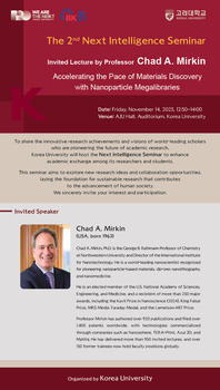 고려대학교는 오는 14일 오후 12시 50분 교내 대강당 아주홀에서 미국 노스웨스턴대학교 채드 A. 머킨(Chad A. Mirkin) 교수를 초청해 제2회 Next Intelligence Seminar(미래 지성 세미나, 이하 NIS)를 연다고 13일 밝혔다.이번 세미