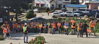 야간 여객선을 타고 6일 아침 도착한 울릉도 사동리. 기자가 마주한 첫 풍경은 주황색 조끼를 입은 주민들이 들고 선 피켓이었다."짧은 활주로 안전은 어디에?", "생명줄 놓치면 국토부가 공범이다."울릉공항 건설 현황 브리핑이 열리는 날, 주민들은 현장 밖에서 집회를 열