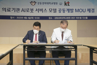 KT가 강동경희대학교병원과 ‘의료기관 AI로봇 서비스 모델 공동개발 업무협약’을 체결하고 AI 로봇 기술을 활용한 병원 업무 디지털 전환에 나선다고 4일 밝혔다.양사는 이날 오전 강동경희대학교병원 본관 인산홀에서 ‘의료기관 AI로봇 서비스 모델 공동개발 업무협약’을 체