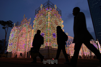 롯데물산이 11일 오후 서울 송파구 롯데월드타워 월드파크광장에서 2026년 첫 시그니처 행사인 '2026 롯데 루미나리에 Wish Shines On'을 선보이고 있다. 올해 롯데 루미나리에는 지난해보다 3배 커진 규모로, 전통적 고딕 양식의 구조물들이 성스럽고