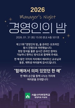 서울사이버대학교는 경영학과가 오는 31일 오후 3시 교내 A동 501호에서 '제21회 2026 경영인의 밤' 행사를 연다고 28일 밝혔다.서울사이버대 경영학과 학생회와 동문회는 지난 2006년부터 교수진, 동문 선후배 등이 참여해 인적 네트워크를 쌓을 수 있는 교류의