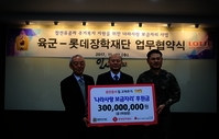 롯데장학재단은 22일 '나라사랑 보금자리' 사업 지원기금 3억원을 육군본부에 전달했다고 밝혔다. 나라사랑 보금자리는 6·25와 월남전 참전용사 중 형편이 어려운 사람을 선정해 열악한 주거환경을 개선해주는 프로젝트다.롯데장학재단은 이날 충남 계룡대 육군본부에서