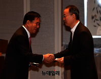 백운규 산업통상자원부 장관이 14일 오전 서울 송파구 롯데월드타워 시그니엘 호텔에서 열린 대산 첨단화학 특화단지 공동추진 협약식에 앞서 자리하고 있다. 앞서 산업통상자원부와 석유화학업계가 만나 간담회를 진행했다. 간담회에는 김재율 대림산업 사