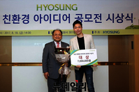 효성이 '친환경 아이디어 공모전' 시상식을 개최했다. 18일 효성은 마포 본사에서 6월부터 진행한 '친환경 아이디어 공모전'의 시상식을 진행했다. 대상은 한양대학교 김범경 씨가 '무선 전자기기 충전 신발'로, 최우수상은 한동대 이동영∙한정현 씨가 '제올라이트 필터를 적