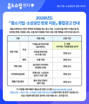 홈앤쇼핑이 판로 개척에 어려움을 겪는 중소기업과 소상공인을 대상으로 한 2026년도 판로지원 사업을 대폭 확대한다. TV홈쇼핑과 모바일, 해외 수출을 연계한 맞춤형 지원 체계를 구축해 단기 판매를 넘어 지속 가능한 판로 확보까지 지원하겠다는 구상이다.홈앤쇼핑은 최근 ‘