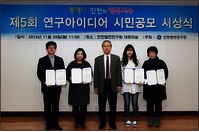 인천지역 발전을 위한 '시민 아이디어 공모전'의 수상자가 한 곳에 모였다.인천발전연구원은 28일 원내 대회의실에서 '쑥쑥! 인천의 행복지수' 연구아이디어 시민공모 시상식을 가졌다고 29일 밝혔다.올회 5회를 맞은 시민 아이디어 공모전은 인천에 거주하거나 재직, 재학 중