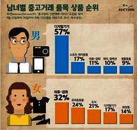 중고 거래에서 남성은 '디자털 기기'에, 여성은 '의류·잡화'에 치중한 것으로 나타났다.옥션은 '중고장터 간편택배 서비스' 도입을 맞아 회원 대상으로 설문조사를 한(1330명, 9.22~30) 결과, 남성은 디지털기기(57%), 여성은 의류·잡화(3