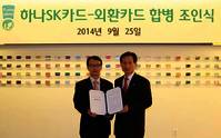 하나SK카드와 외환카드가 25일 통합카드사 출범을 위한 합병 계약을 체결했다. 25일 하나SK카드에 따르면 이날 오전 하나SK카드 본사 2층에서 정해붕 하나SK카드 사장과 권혁승 외환카드 사장 등 양사 임원들이 참석한 가운데 합병 계약서 체결식이 열렸다. 앞서 양