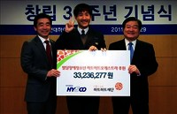 현대하이스코는 내달 1일 창립 36주년을 앞두고 창립 기념행사를 29일 잠원동 사옥에서 열었다. 현대하이스코는 글로벌 자동차 강판 리더로 도약한다는 비전을 다짐하고 임직원들이 자발적으로 모금한 기부금 3천300여만원을 복지법인인 '하트하트재단'에 전달했다. 이 재단에