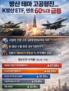 방산 관련 상장지수펀드(ETF)가 연초부터 수익률을 60% 넘기는 등 고공행진이다. 미국의 베네수엘라 군사작전과 그린란드 관련 발언, 국방비 증액 기대가 지정학 리스크를 키우며 수익률을 끌어올렸다.다만 방위비 확대와 K-방산 수출 모멘텀으로 전망은 긍정적이지만 변동성이