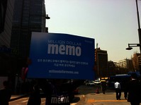 “밀리언달러 메모 받아보셨나요” 13일 낮 점심시간을 전후해 2시간 가량 위와 같은 문구를 쓴 플래카드와 영문으로 ‘Million dollars’라고 쓴 피켓이 광화문 로터리에 등장했다. 젊은 사람들이 들고 있었다. 같은 문구가 쓰인 서핑 보드를 든 젊은이도 행인과