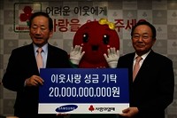 삼성은 21일 사회복지공동모금회 나눔마을(대회의실)에서 이수빈 삼성생명 회장과 이창렬 삼성사회봉사단 사장, 이동건 사회복지공동모금회 회장 등이 참석한 가운데 연말 이웃사랑 성금으로 200억원을 전달했다. 이…