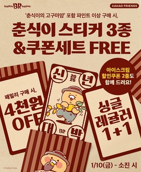 ◇배스킨라빈스, 새해 맞이 할인 쿠폰 증정 이벤트배스킨라빈스가 새해를 맞아 춘식이 스티커와 할인 쿠폰을 증정하는 이벤트를 진행한다.이번 프로모션은 매장에서 1월 이달의 맛(춘식이의 고구마얌!) 제품을 포함해 파인트 사이즈 이상 구매하는 고객을 대상으로 진행된다.&nbs