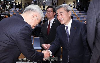 신현송 신임 한국은행 총재가 21일 오전 서울 중구 한국은행에서 열린 취임식에서 임직원들과 인사를 나누고 있다.
