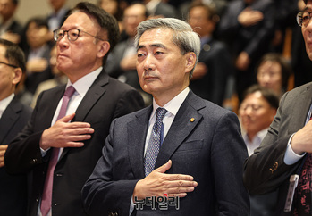 신현송 신임 한국은행 총재가 21일 오전 서울 중구 한국은행에서 열린 취임식에서 국기에 대한 경례를 하고 있다.