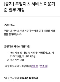 이제 쿠팡이츠에서 간편결제 서비스 외 일반결제로도 음식 주문이 가능해진다. 29일 관련 업계에 따르면 쿠팡이츠는 12월5일부로 결제방식 다양화에 나서기로 하고 서비스 이용기준을 일부 개정하는 내용의 공지를 올렸다. 기존까지 쿠팡이츠에서 음식을 주문하려