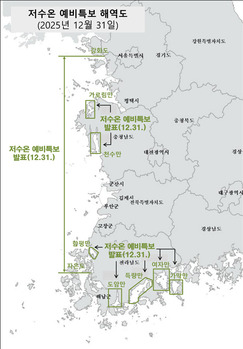 해양수산부는 31일 오후 3시부로 저수온 위기경보 '주의' 단계를 발령했다고 밝혔다.이는 국립수산과학원이 수온 하강이 예상되는 서해와 남해 연안(내만 포함)에 저수온 예비주의보를 발표한 데 따른 조치다. 현재 서해 및 남해서부 연안 수온은 6~9℃다. 북극 온