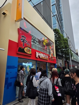 지난 15일 한낮 도쿄 하라주쿠 다케시타 거리. 평일 낮임에도 좁은 골목은 발 디딜 틈 없이 붐볐다. 하라주쿠역에서 5분 정도 걷다보면 형형색색 간판 사이로 빨간색으로 단장한 ‘신라면 분식’ 매장이 등장하다. 매장 앞에는 사진을 찍거나 줄을 서는 젊은 소비자들이 즐비하