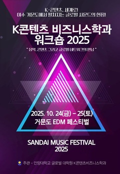 안양대학교 글로벌대학원 K콘텐츠비즈니스학과는 오는 24, 25일 이틀간 전남 여수시 거문도에서 열리는 EDM(Electronic Dance Music·전자 댄스 음악) '산다이 뮤직페스티벌'에 맞춰 워크숍을 진행한다고 20일 밝혔다.이번 워크숍은 국내·외 유명 뮤지션과