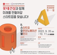 롯데건설이 부산창조경제혁신센터와 10월11일까지 'B.스타트업 오픈이노베이션 챌린지 2022' 프로그램을 개최해 우수 스타트업을 모집 중이다.22일 롯데건설에 따르면 본 챌린지는 우수한 혁신 기술과 서비스를 가진 스타트업을 발굴해 대기업과의 협업, 시장 검증 기회 제공