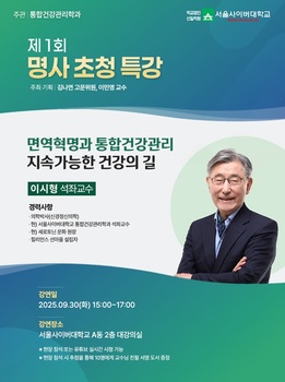 서울사이버대학교가 오는 30일 교내 A동 2층 대강의실에서 이시형 석좌교수를 모시고 '제1회 명사 초청 특강'을 연다고 4일 밝혔다.이번 행사는 통합건강관리학과가 주관한다. 이 석좌교수는 '면역 혁명과 통합건강관리: 지속 가능한 건강의 길'을 주제로 강연을 진행한다.특