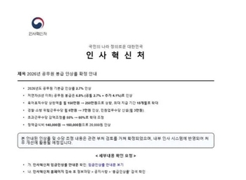 '저연차 공무원 봉급 6.8% 인상, 육아휴직 수당 월 최고 250만원 상향 조정' 등 내용이 담긴 정부 기관 공무서가 온라인상에 확산하고 있다. 인사혁신처발 '2026년 공무원 봉급 인상률 확정 안내'라는 제목의 이 문서는 허위로 밝혀졌다.20일 인사혁신처와 서울시
