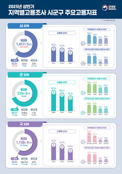 올해 상반기 9개 도의 시지역 고용률이 62.6%로 관련 통계 작성 이래 최고치를 기록했다. 다만 군 지역과 특광역시 구지역은 인구 감소 등으로 하락세를 보였다. 21일 통계청이 발표한 '2025년 상반기 지역별 고용조사'에 따르면 강원·경기·경남·경북·전남·