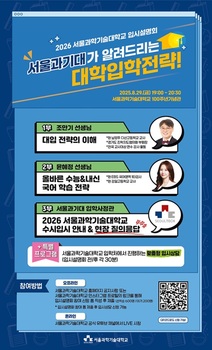 서울과학기술대학교는 오는 29일 오후 7시부터 8시 30분까지 교내 100주년기념관 대강당에서 '2026 서울과기대가 알려드리는 대학입학전략' 입시설명회를 연다고 16일 밝혔다.이번 설명회는 2026학년도 대입을 앞둔 수험생과 학부모에게 입시 전략과 학습 방향을 제시하