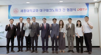 세종대학교 인공지능융합연구원이 지난 7일 교내 집현관 10층 소회의실에서 대구테크노파크와 인공지능(AI) 기술 협력과 지역산업 경쟁력 강화를 위한 업무협약(MOU)을 맺었다고 11일 밝혔다.양 기관은 이번 협약을 통해 AI 분야의 공동 정책과제를 발굴하고 이를 기반으로