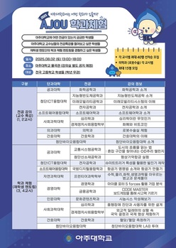 아주대학교가 다음 달 2일 교내에서 고등학생을 대상으로 'AJOU 학과체험' 행사를 연다고 17일 밝혔다.이번 행사는 대학 전공 체험을 통해 적성과 진로를 탐색할 기회를 제공하고자 마련됐다.17일부터 25일까지 전국 고등학생 400명을 선착순 모집한다. 신청은 아주대
