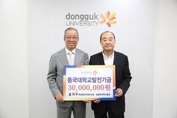 동국대학교는 지난 2일 본관 4층 총장 접견실에서 전 총장인 송석구 백성욱연구원 이사장이 학교발전기금 3000만 원을 기부했다고 3일 밝혔다.이날 기부금 전달식에는 송 이사장을 비롯해 백성욱연구원 회원 6명과 윤재웅 총장, 김용현 교무부총장, 이경철 대외협력처장, 박찬