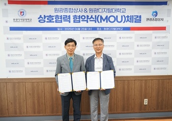 원광디지털대학교는 지난 25일 익산캠퍼스에서 주식회사 원광종합상사와 인적 교류·상호 발전을 위한 단체협약(MOU)을 맺었다고 27일 밝혔다.이날 협약식에는 원광디지털대 김윤철 총장과 원광종합상사 김영택 대표 등 양측 관계자 6명이 참석했다.원광종합상사는 사무기기·용품·