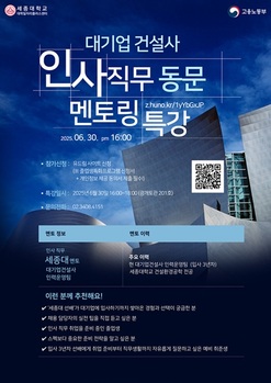 세종대학교 대학일자리플러스센터는 졸업생의 직무 이해도 제고와 실질적인 취업 전략 수립을 지원하기 위해 오는 30일 오후 4시 교내 광개토관 201호에서 대기업 건설사 인사 담당자를 초청한 '동문 멘토링 특강'을 진행한다고 26일 밝혔다.이번 특강에는 국내 주요 건설사의