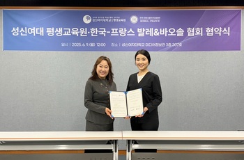 성신여자대학교 부설 평생교육원이 지난 9일 서울 성북구 돈암수정캠퍼스 미디어정보관에서 한국-프랑스발레&바오솔협회와 교육 증진·상호 교류를 위한 업무협약(MOU)을 맺었다고 11일 밝혔다.이날 협약식에는 김순정 성신여대 평생교육원장과 오영주 한국-프랑스발레&