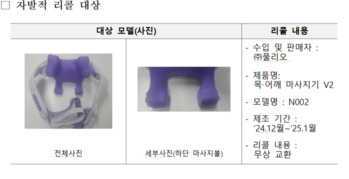산업통상자원부 국가기술표준원은 ㈜풀리오가 판매한 목·어깨 마사지기 V2(모델명: N002)의 일부 제품에 대해 자발적 리콜(제품 무상 교환)을 실시한다고 26일 밝혔다.리콜 대상은 지난해 12월부터 올해 1월까지 생산한 제품 8만대다. 마사지기 연결 끈에 부착된 표시