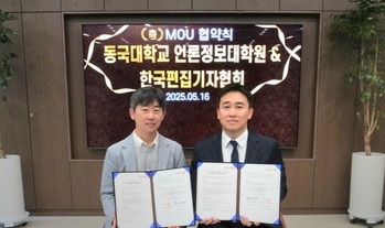 동국대학교 언론정보대학원은 지난 16일 서울캠퍼스 사회과학관 3층 D-스퀘어에서 한국편집기자협회와 산·학 협력 활성화를 위한 업무협약(MOU)을 맺었다고 20일 밝혔다.이번 협약은 편집 저널리즘 분야의 교육·연구 협력 기반을 갖추고 현직 언론인의 전문 역량을 강화하기
