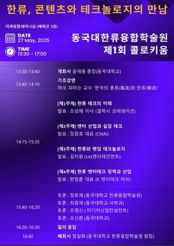 동국대학교 한류융합학술원은 오는 27일 오후 1시 30분부터 교내 혜화관 미래융합세미나실에서 '한류, 기술로 만나다'를 주제로 제1회 콜로키움을 연다고 20일 밝혔다.이번 콜로키움은 한류의 현재를 진단하고, 첨단 기술과 한류 콘텐츠를 융합해 새로운 사업 모델을 창출하고