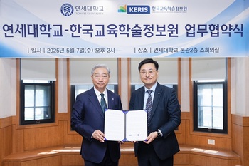 연세대학교는 지난 7일 본관에서 한국교육학술정보원(KERIS)과 교육·연구 분야 협력 강화를 위한 업무협약(MOU)을 맺었다고 8일 밝혔다.이날 협약식에는 연세대 윤동섭 총장, 남혜현 학술문화처장(도서관장)과 KERIS 정제영 원장, 정광훈 학술데이터본부장 등이 참석했