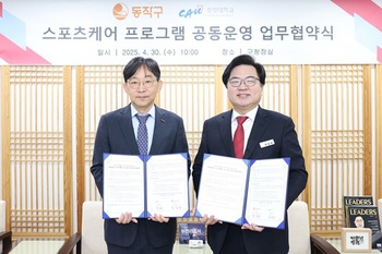 중앙대학교는 지난달 30일 서울 동작구청에서 동작구와 '지역 커뮤니티 스포츠 활성화와 복지 증진을 위한 공동운영 협약'을 맺었다고 1일 밝혔다.이날 협약식에는 중앙대 박상규 총장, 박광용 교학부총장, 김혜영 교양대학장, 정우영 교수, 이경미 교양대학 교학지원팀장과 동작